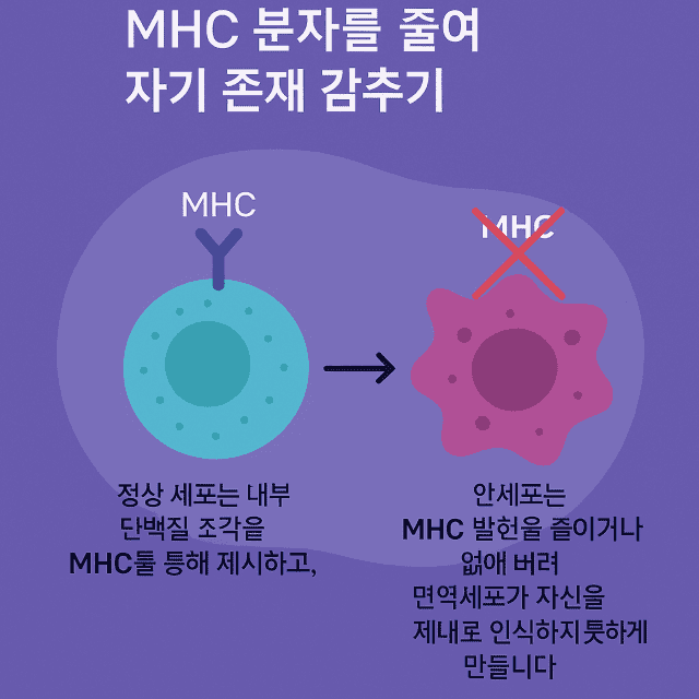 그러나 암세포는 MHC 발현을 줄이거나 없애 버려, 면역세포가 자신을 제대로 인식하지 못하게 만듭니다. 마치 신분증을 내지 않고 군중 속에 숨어드는 것과 같은 방식입니다.