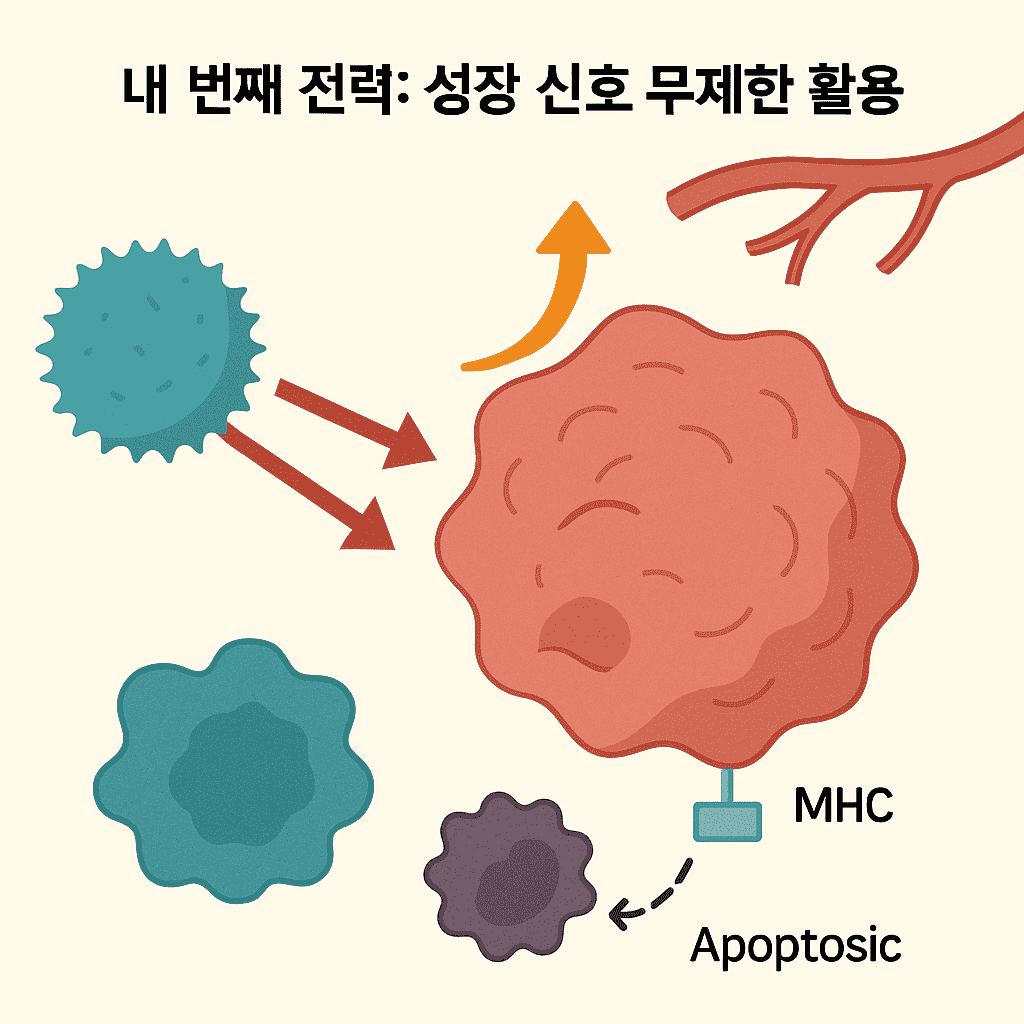 하지만 암세포는 성장 신호를 무한히 켜두는 돌연변이를 가지고 있어, 면역이 공격해도 금세 다시 증식합니다.